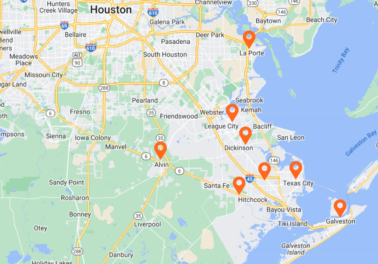 Our service area covers southeast Harris County, Galveston County, and northern Brazoria County.