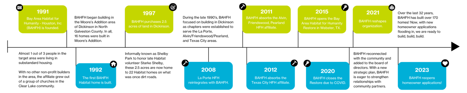 Bay Area Habitat for Humanity Houston (BAHFH) is part of a global, nonprofit housing organization operated on Christian principles that seeks to put God’s love into action by building homes, communities and hope.