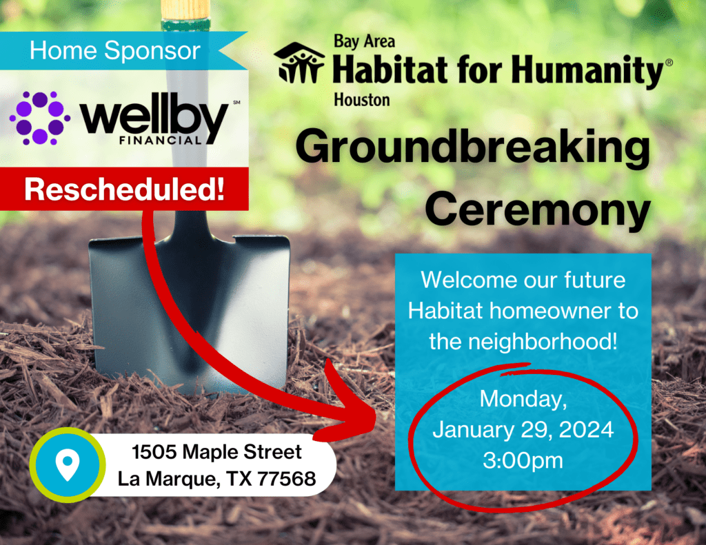 Bay Area Habitat for Humanity is excited to host our next groundbreaking ceremony in La Marque! With a full home sponsorship by Wellby Financial, we cannot wait to start building this home alongside our future Habitat homeowner, Dalia, and our community members! Enjoy musical performances, remarks from Mayor Keith Bell of the city of La Marque, a blessing of the ground by a local pastor, and more.