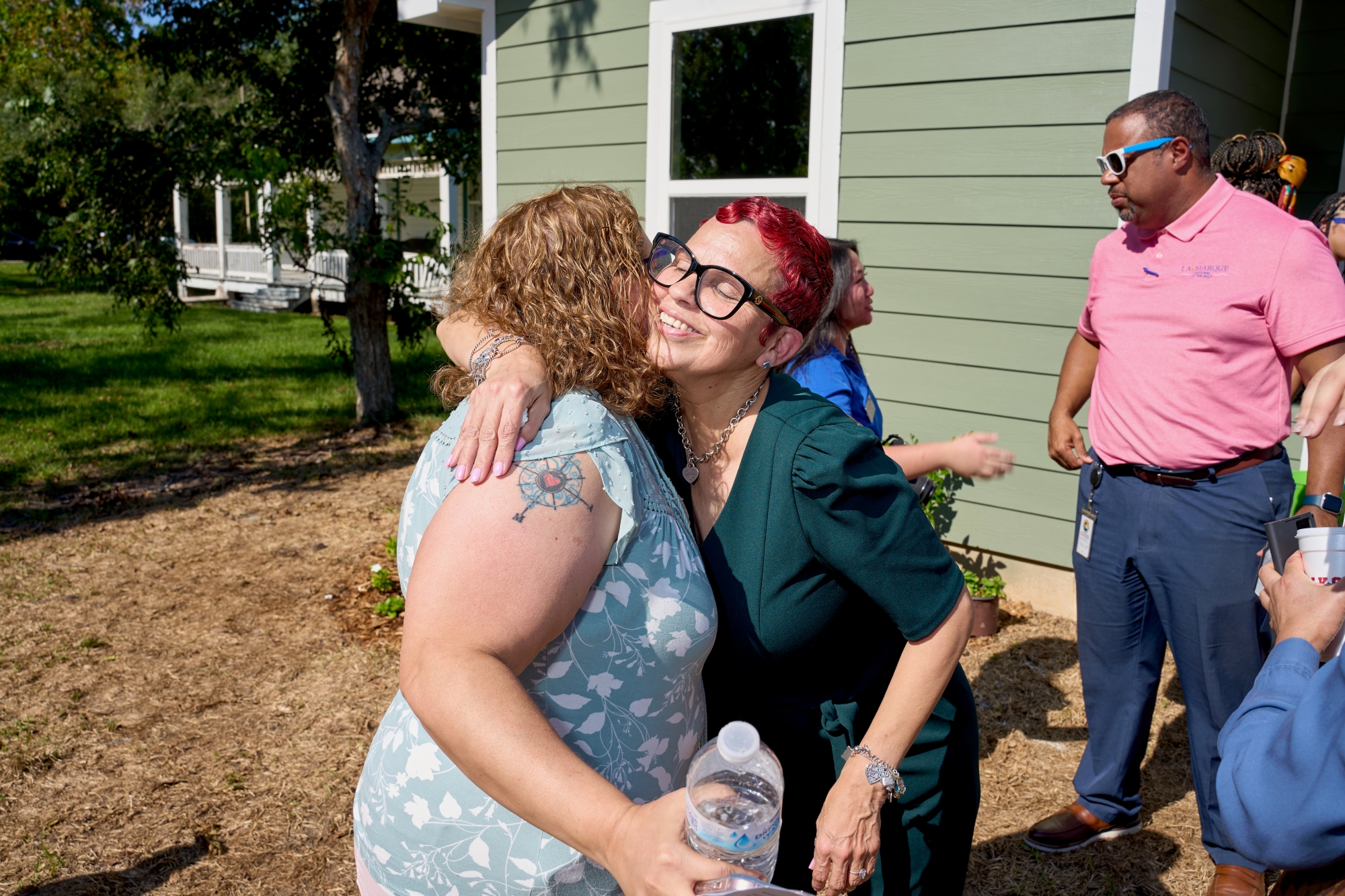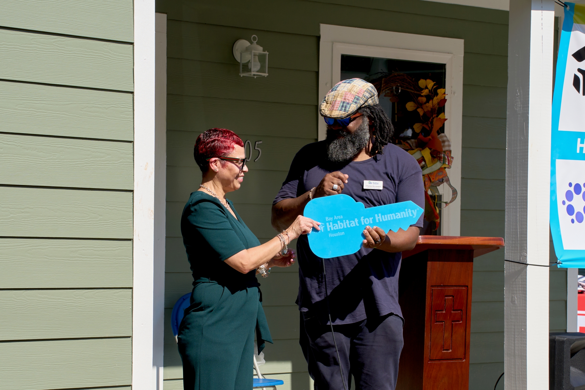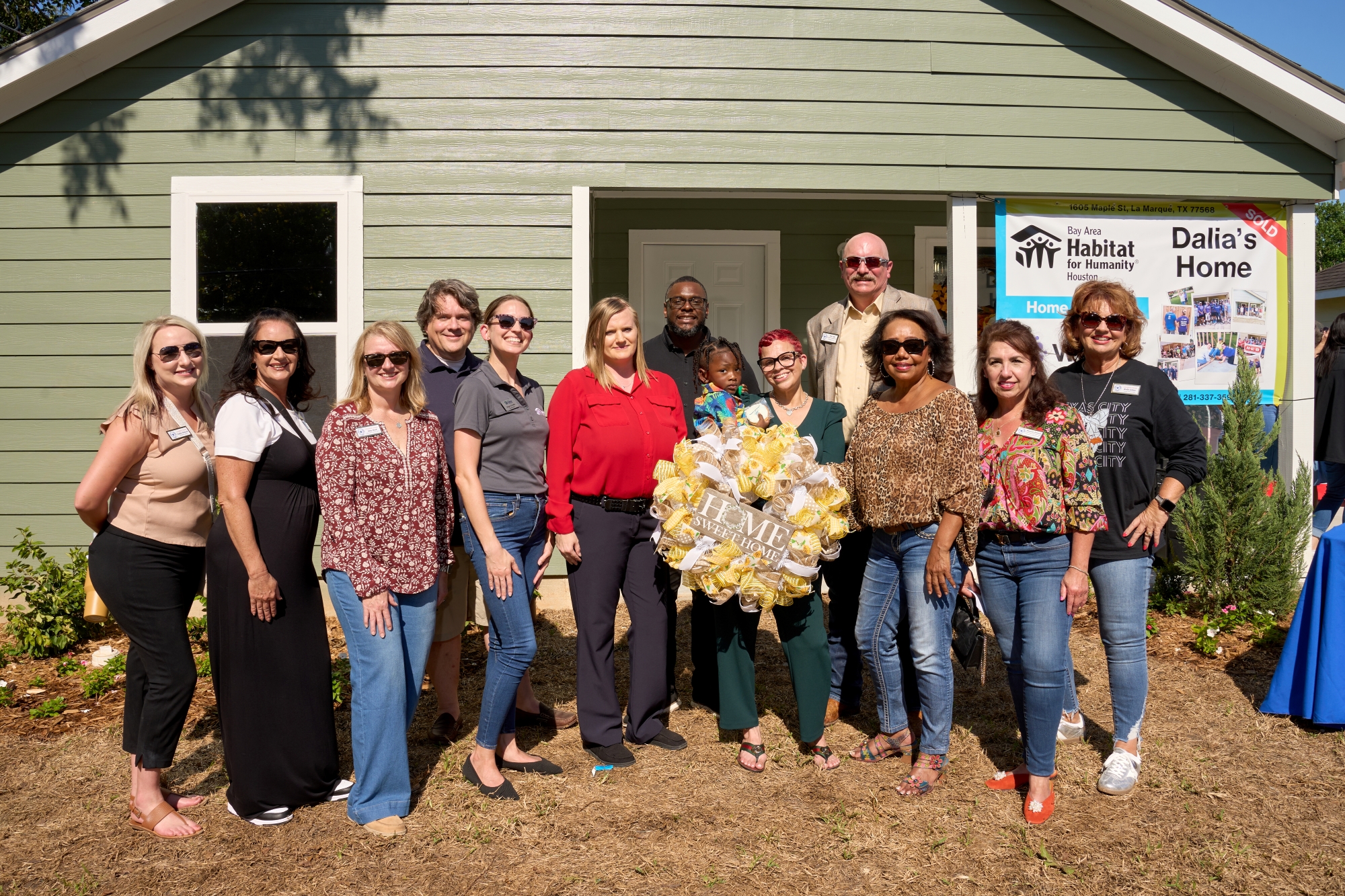 Dalia was warmly welcomed to her new neighborhood by City Manager Cesar Garcia of La Marque and showered with housewarming gifts from the Texas City-La Marque Chamber of Commerce, Pastor Ingrid Clark of First UMC La Marque and St. John’s UMC, Friends of Freeman Library, and American Furniture Warehouse! The Texas City ISD ITC students, represented by carpentry instructor Lee Taylor, proudly presented their student-built shed, while Dalia’s H-E-B family came out in full force, offering thoughtful gifts and refreshments for the reception.